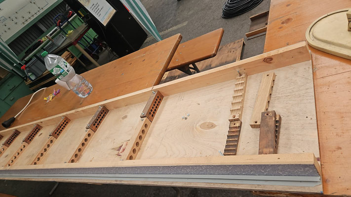 In der Zwischenzeit wurden weitere Teile wie das Pedalwerk aufgearbeitet. Nun ging es an die Lackierung des Daches. In einer zweitägigen Aktion wurde das Dach gereinigt, abgeklebt, angeschliffen und in einem dunkelgrau lackiert. Dies ist notwendig für das weitere Vorankommen!