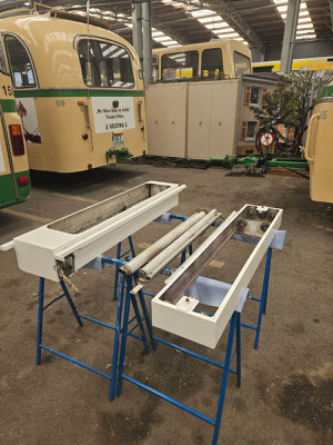 Die Aufarbeitung weiterer Komponenten, z.B. Schilderkästen und Stromabnehmeraufbauten befinden sich in Aufarbeitung, sodass diese demnächst eingebaut werden können.