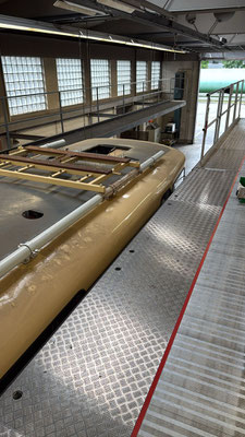 Deshalb wurde die von den aktiven Vereinsmitgliedern komplett entkernte Karosse zur Firma Rein Omnibus in Sinn/Hessen verbracht. Dort wurde zunächst die komplette Außenhaut des Fahrzeuges entfernt. Nach erfolgter Aufarbeitung wird die tragende Struktur neu beblecht und anschließend lackiert.